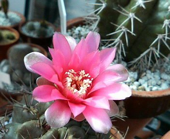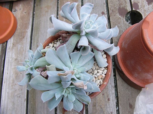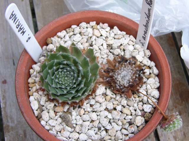 本日は、久々の植替え。 今日は、鉢から抜き出し、根の整理。 今は、温室で、乾かし中。 本日植替え者は・・・・ サボテン ・玉翁 ・ピンクニンフ ・月影丸 ・暗黒王 ・希望丸 ・白美人 多肉植物 ・ファンファーレ ・トップスプレンダー(写真↑) ・arachnoidum Robln' (センペルビブム) ・MARINA(センペルビブム) 今までは、カイガラムシや、ネジラミ、ワタムシがひつこく、ついていたが、 今年は、特に、多肉植物の方に、蟻がものすごくたかっていた。 特に、被害が大きかったのは、写真のトップスプレンダーと、写真はないが、 ファンファーレ。 見た目は、分からないが、黒いぶつぶつがあり、中のほうに、ありのようなもの? 分からないが、小さく、白く、米粒のような小さな虫が、沢山付いていた。 ブラシで、こすったりしたが、全部は取りきれなかった。 もっと前に、気付いてはいたが・・・・ すぐに植替えしなかった。 そのせいで、いくつか駄目になった。 上の写真(トップスプレンダー)も、幾つか子が成長し、元気なら、株分けできたが、 かじられて、ぼろぼろだったので、一株だけのこし、すべて処分した。 この小さくて、白い虫はなんなのだろうか? そして、蟻は・・・ ※写真は、植え替える前のもの ☀