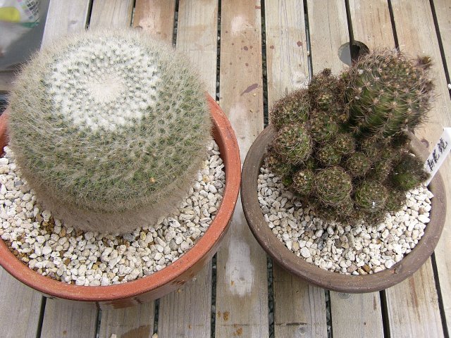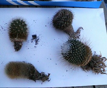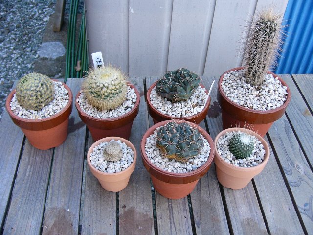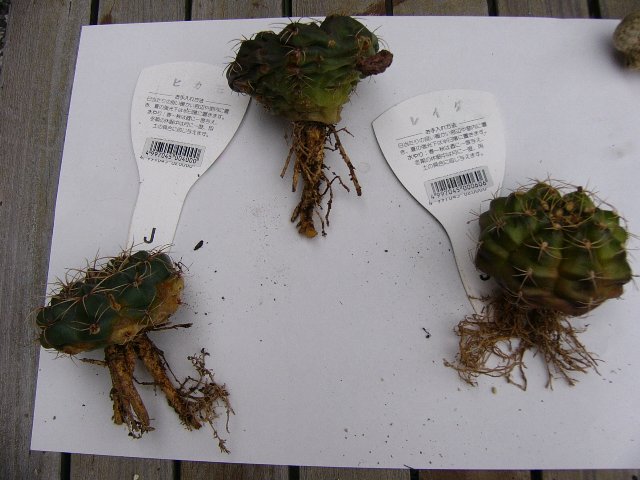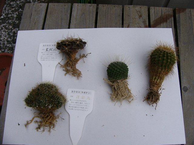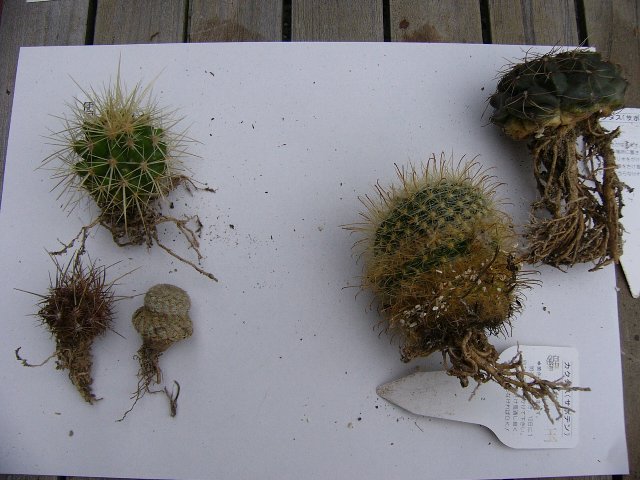 ようやく晴れたので、昨日に引き続き、サボテンの植替え再開。 本日は、根っこ乾かし中だったものの植替えと胴切り作業です。 この整列しているサボたちは、植替えが終ったところ。 左上から、明星、錦繍玉(キンシュウギョク)、緋花玉、名前不明。