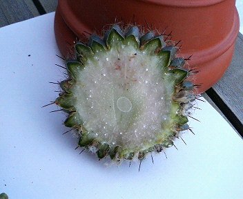 根元はさわると、柔らかく、色もおかしいような感じだったので、胴切りした。 切って見ると、思った以上に、中が、赤紫色になっていた。