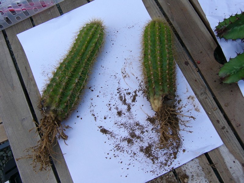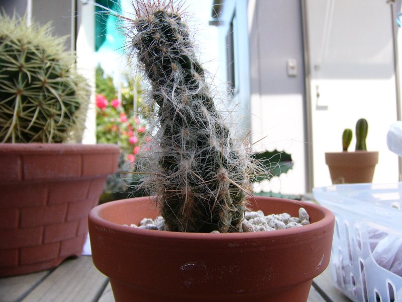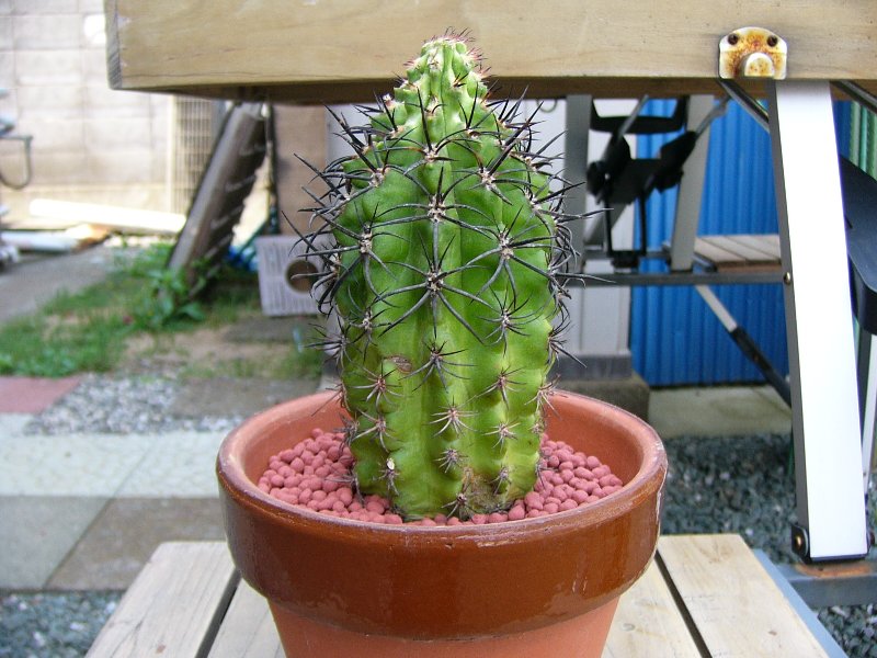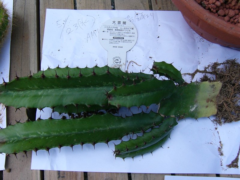 だいぶ長くなって、倒れるようになったので、植替えと、丈夫そうなところで、カットし、挿し木で増やすことにした。この間、下の根のほうは植替えが、終った。上のほうは、あと2週間ぐらい、根が出るまで乾かしているところです。 サボテンを育てはじめてから、約3年くらいがたった。 きっかけは2年前に伊豆シャボテン公園に行って購入してから。 それから、集め始めるようになった。 まだ植替えの仕方や、水やり、病気など、分からない事だらけで、本を見て調べながら、様子を見ています。 成長記録をしておくことで何か分かるかも知れないので、記録をすることにしました。