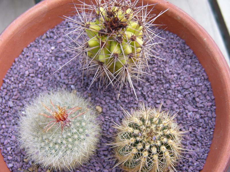 頭の徒長が気になるが、秋か春の成長期で様子を見たほうが良いと思う。日光を春か秋にたっぷり浴びれば、大丈夫だと思う。化粧砂は迷った挙句ハイドロカルチャー用ですることにした。鉢底には軽石を少しと、元肥を少し、入れた。(4号鉢) ちゃんと育ってくれるだろうか心配。秋の半ばくらいに様子を、弟に聞いてみる予定。(3号鉢) その他の植替えの様子 子サボ寄せ植え ライオン錦 断琴丸 子サボたちは丸サボは伊豆シャボテン公園で購入したもの。一緒に植えていたものが少し様子がおかしかったので、急遽植替えを。その右上のは柱サボ。近所のホームセンターで購入した物。その下も同じ。化粧砂はヨネヤマで購入した。砂っぽいものなので水遣りに注意が必要。秋に様子を見る。(4号鉢) ライオン錦は、2年位前にコップに固められたなかで売っていた。ホームセンターで購入。