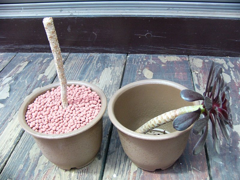 左の小さいサボは、したの方が、枯れ気味だったので、実験もかねて、同切をしたもの。右側のは、三角柱。植えに緋牡丹(赤)がのっていたが、枯れてしまい、三角柱だけでもとっておいた。これも下のほうと、上のほうは、同切りにして乾かしている。
