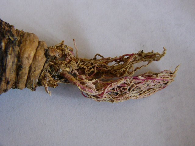 買ったときは名札が付いていたのだけれど、捨ててしまったため、分からなくなってしまった。 植替えのとき、鉢から出した時、特に異常はなかったのだが、抜きだして、2~3日したら、このように、根が赤紫色に・・・ 根腐れしていた。 そこで、今日胴切りしてみることにした。